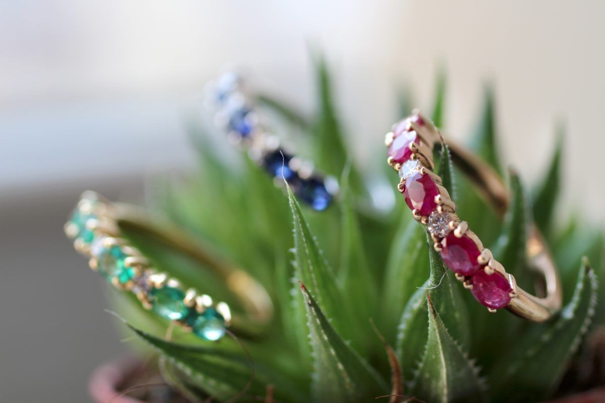 Media alianza muy original de oro rosa 18k con 5 rubíes ovalados de 4 × 3 mm, dos diamantes talla brillante con un peso total de 0,08QQ, color H-VS, diseño atempòral, original, único con estilo que te hace diferente. Todas nuestras joyas están diseñadas y fabricadas en Barcelona.
