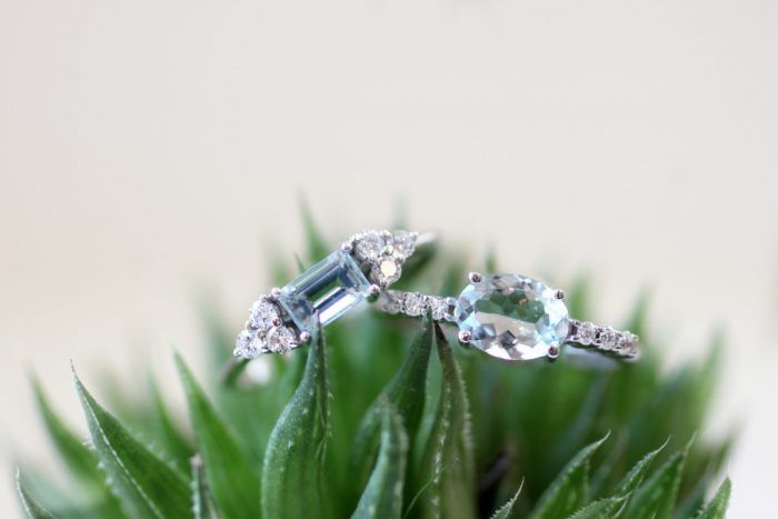 Anillo para mujer de aguamarina talla esmeralda, ideal para componer en oro blanco de 18k, la aguamarina tiene unas dimensiones de 7 × 5 mm y viene decorada con 3 brillantes por cada lado, peso total de 0,18 QQ y de calidad H-VS, precioso anillo por su acabado, diseño y contraste. Todas nuestras joyas están diseñadas y fabricadas en Barcelona.