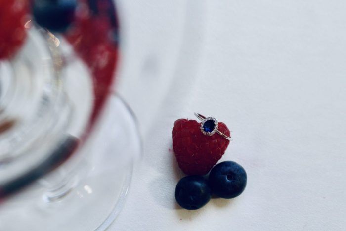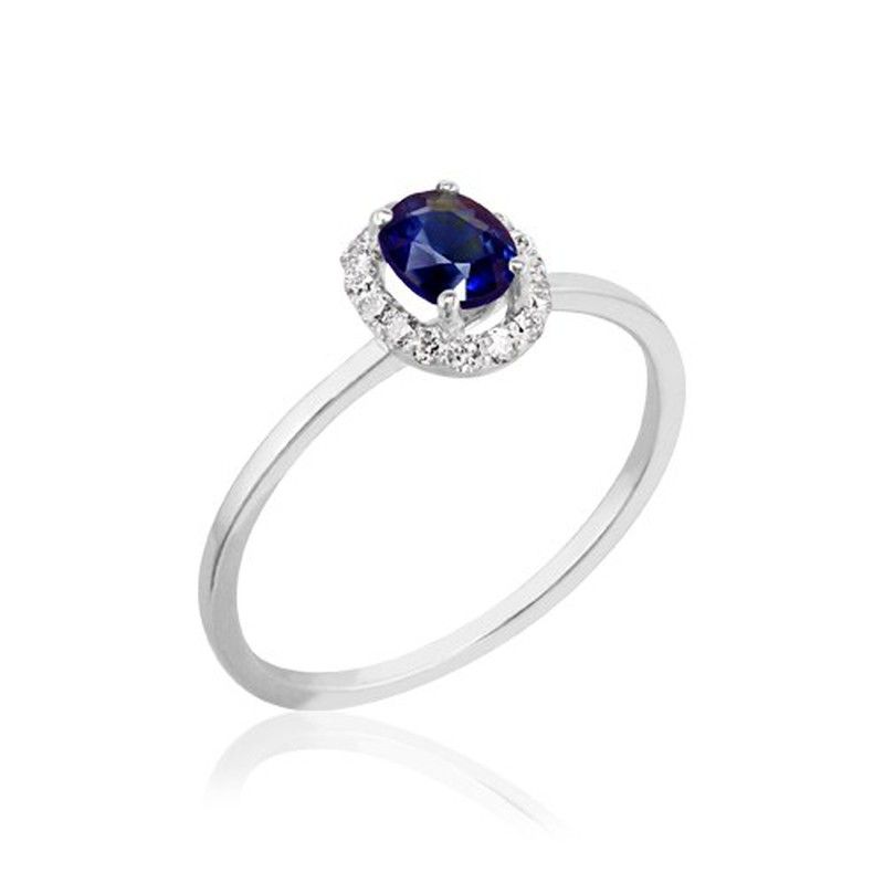 Anillo para mujer de oro blanco 18k con rosetón de diamantes talla brillante y un peso de 0,16 QQ, calidad H-VS, zafiro azul central de 5 × 4 mm. Simplemente impactante anillo clásico de zafiro ovalado, precioso y original anillo de pedida con un zafiro azul central oval facetado. Todas nuestras joyas están diseñadas y fabricadas en Barcelona, siempre con los acabados y materiales de la máxima calidad. JOYERIA PONT