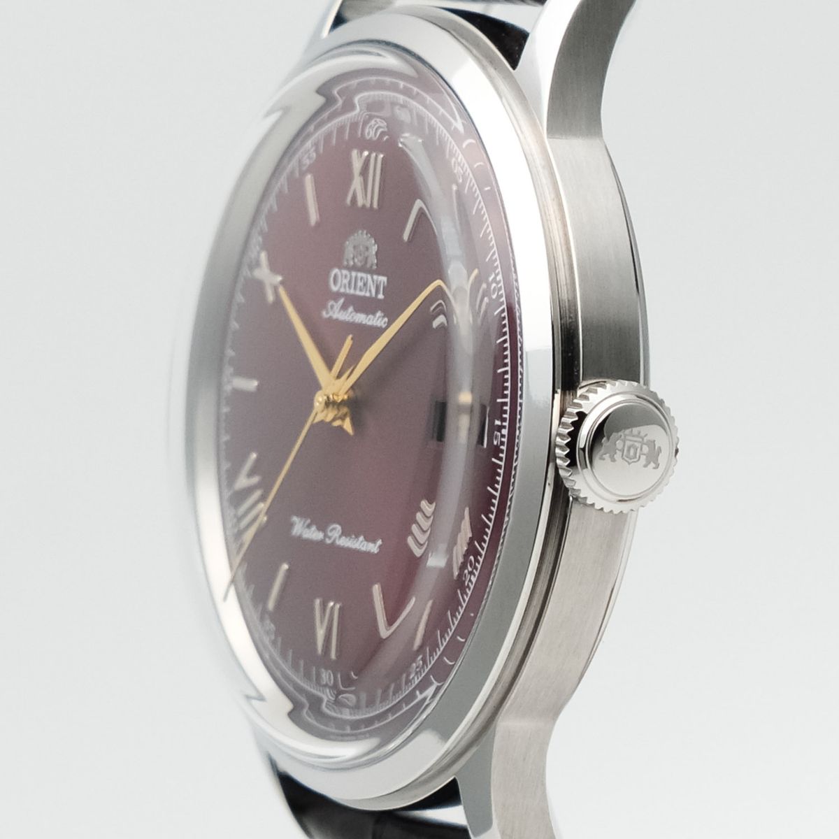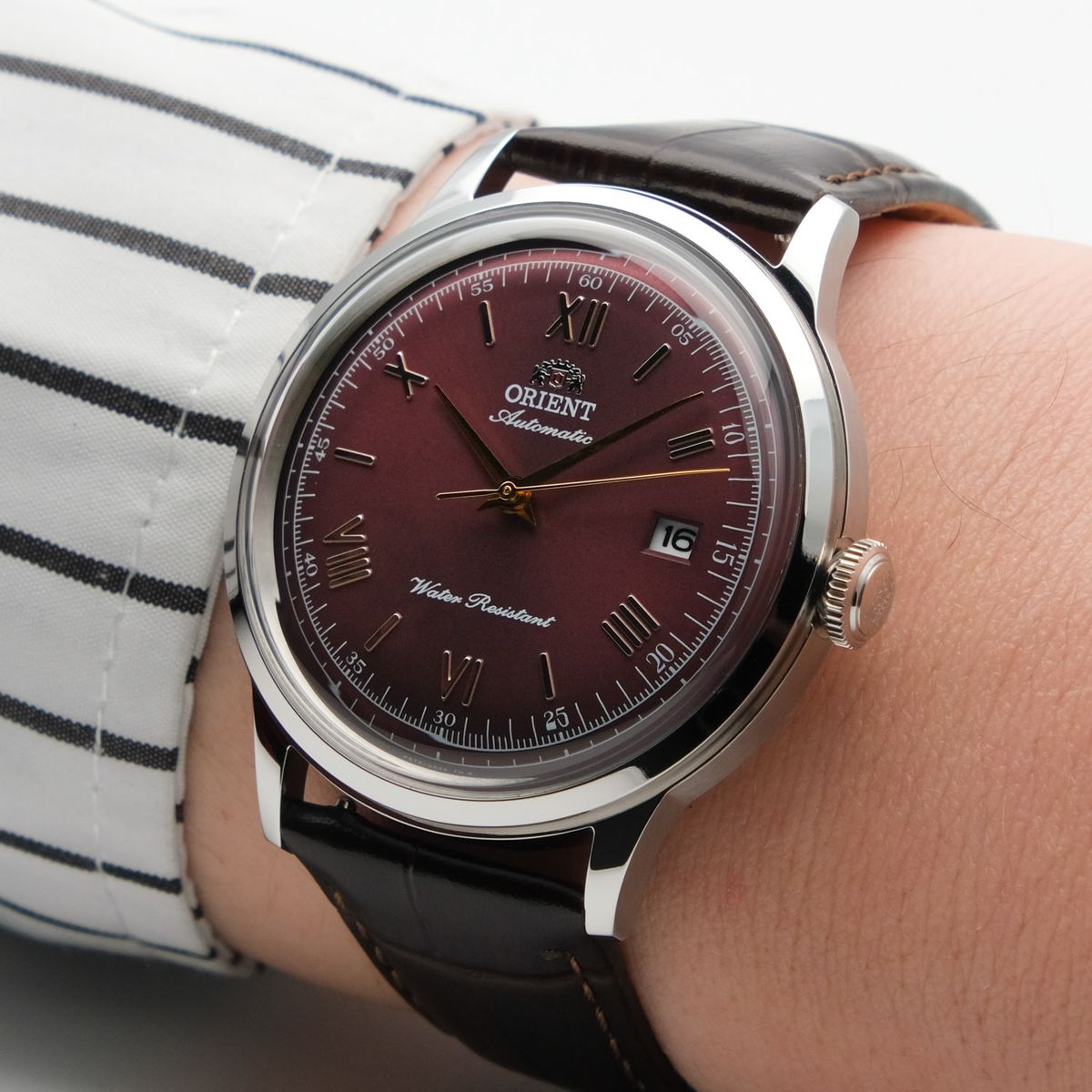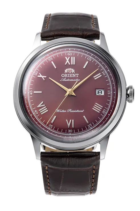 Reloj Orient bambino para hombre movimiento automático RA-AC0026R30B. Movimiento mecánico: Orient calibre F6724, mecanismo de detención de segundero. Reloj con caja de acero inoxidable 316L, correa de piel marrón con pespuntes y esfera en rojo - granate, índices números romanos plateados finos y elegantes y agujas en dorado. Día del mes en la posición de las tres. Cristal mineral curvo. Fondo visto se aprecia maquinaria. Diámetro de caja de 41 milímetros y grosor de caja de 12,3 milímetros. Resistente al agua 30 metros. Estuche y garantía oficial Orient