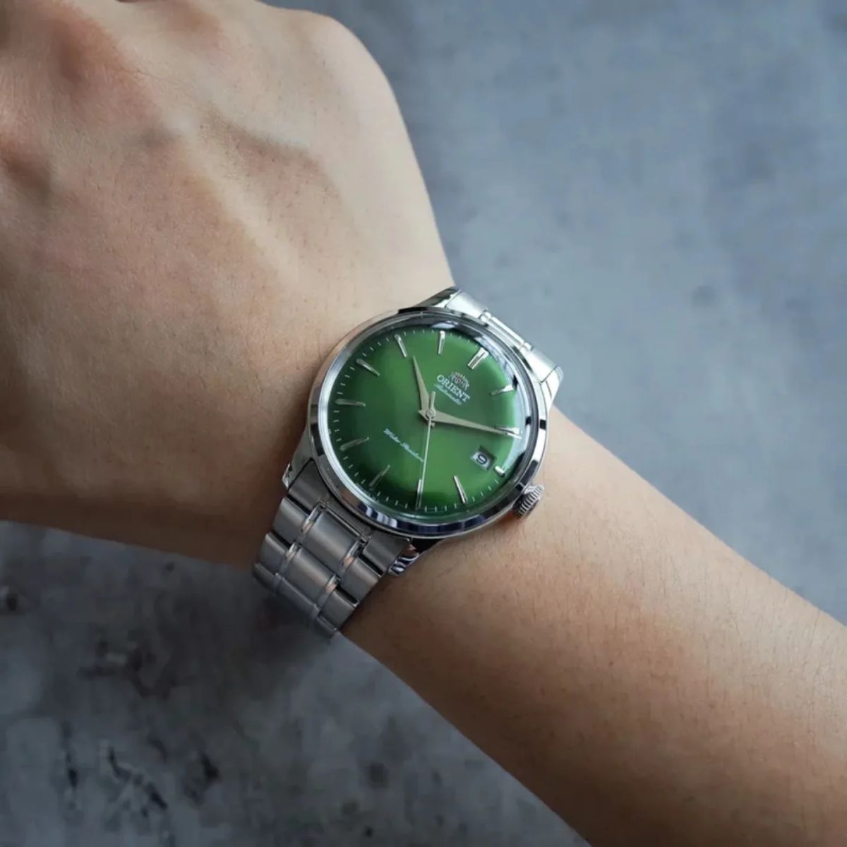 Reloj Orient Bambino de hombre movimiento automático calibre F6724. Tipo de carga automático y cuerda manual. Equipado con calendario y segundero. Resistencia al agua 30 metros (3atm). Cristal mineral curvo endurecido. Corona a presión. Tapa a presión. Brazalete y caja de acero inoxidable 316L. Diámetro de la caja 38mm. Grosor de la caja 12.5mm. Color de la esfera verde. Garantía dos años con servicio técnico oficial incluido.