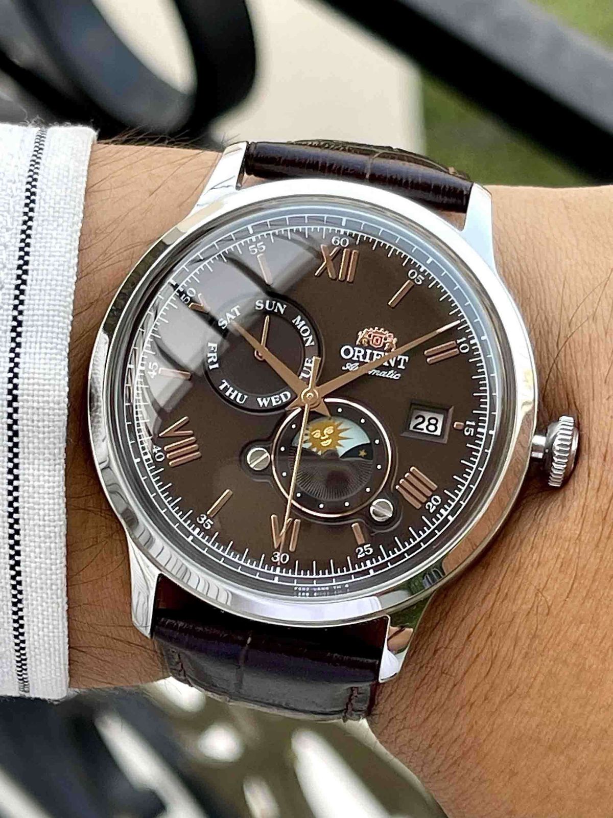 Movimiento Orient caibre F6B24 Tipo de carga Automático, Cuerda manual Funcionalidades Tres agujas, Calendario, Indicador de día de la semana, Reserva de carga +40H, Mecanismo de detención del segundero, Indicador Sol y luna Resistencia al agua 30 metros Cristal Cristal mineral curvo Corona Corona presión Tapa Tapa presión, Ventana al fondo Brazalete Brazalete de piel Diámetro de la caja (mm) 41.5 Grosor de la caja (mm) 14.2 Color de la esfera marrón oscuro. Garantía dos años con servicio técnico oficial incluido.