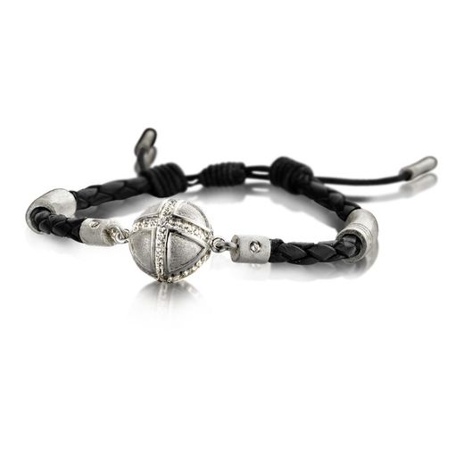 Y, de repente, primavera, pulsera colección Spirit Icons con estampados y formas geométricas con aires más frescos, deportivos, que pisan fuerte en el asfalto, silueta decorada con mezcla de texturas y tejidos. Diseño, estilo y línea muy decorativa y atractiva que seguro que seduce a la primera persona que te la vea puesta en tu muñeca. Cierre cómodo y de fácil ajuste para todas las muñecas. Realizada en piel negra enlazada con decoraciones y bola central con circonitas en plata 1ª ley 925. Diámetro bola : 12 mm. Espesor cuero : 3 mm. Grosor piezas laterales : 5 mm.