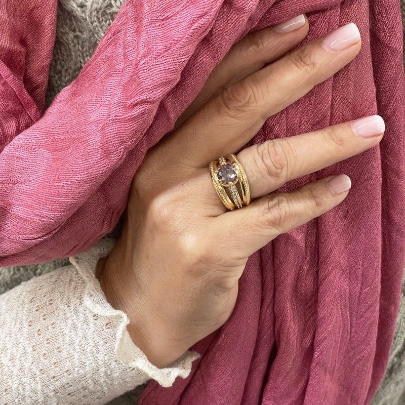 Exquisito anillo PLATA DE PALO de mujer elaborado a mano artesanalmente y manualmente, con tres aros de bronce chapado en oro, circonitas blancas y una elegante pieza central facetada en color marrón en el aro central! Esta joya única fusiona la calidez del bronce con el lujo del chapado en oro, resaltado por el brillo de las circonitas y la profundidad del tono marrón de la piedra central. Diseñado y hecho a mano artesanalmente por PLATA DE PALO en España. Este anillo se manufactura artesanalmente y expresamente para cada cliente. El tiempo de elaboración y entrega es de 5 semanas. Tienda oficial de PLATA DE PALO.