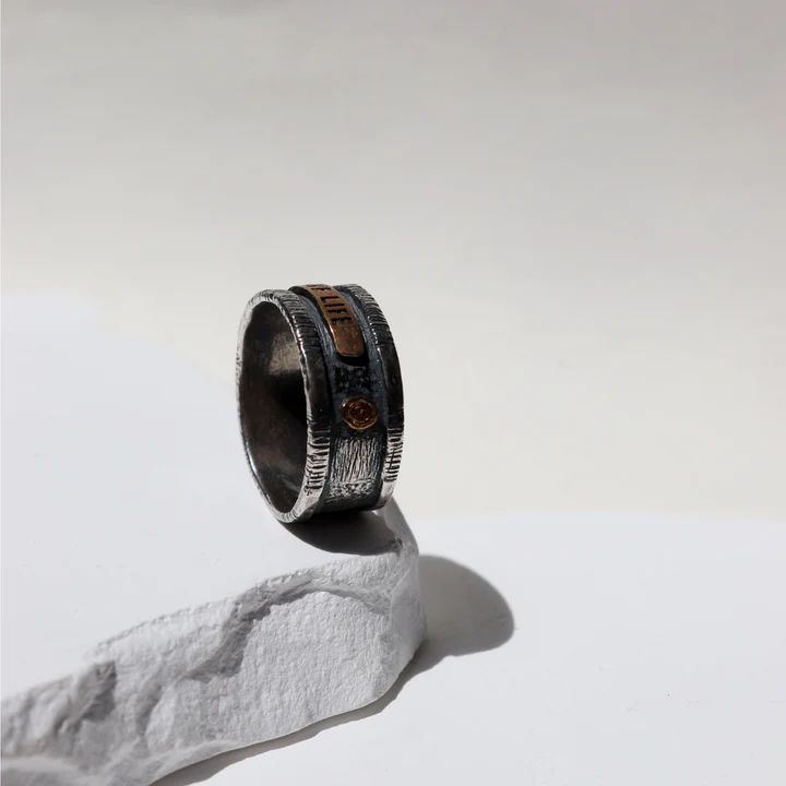 Anillo Plata de Palo para hombre elaborado en plata de ley 925 con placa de bronce "Live life" PLATADEPALO. El anillo colección Unmei es una pieza que habla de destino y propósito. Su nombre, que en japonés significa “destino”, evoca el camino elegido, las decisiones conscientes y la fuerza interior que guía cada paso. El grabado Live Life añade un mensaje claro y poderoso: vivir con intensidad, autenticidad y plenitud. Es un anillo pensado para hombres que valoran la belleza con significado.