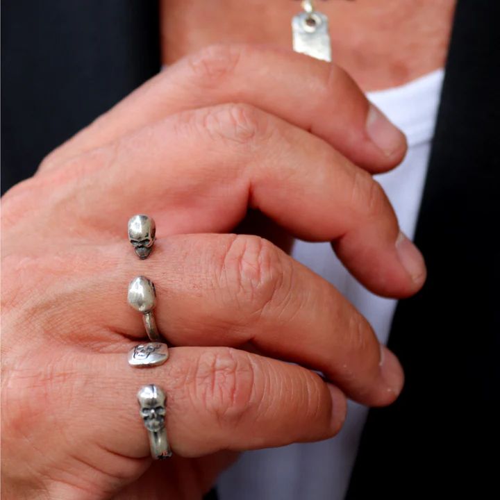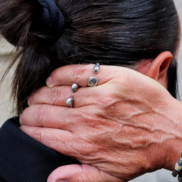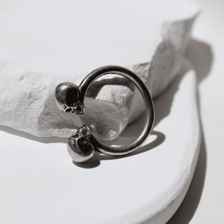 Anillo Plata de Palo unisex Kizuna en plata de 1ª ley 925 abierto por el medio con dos calaveras mirándose en el centro. Este anillo está pensado para quienes han amado intensamente, que llevan consigo historias, personas y momentos que los han transformado.