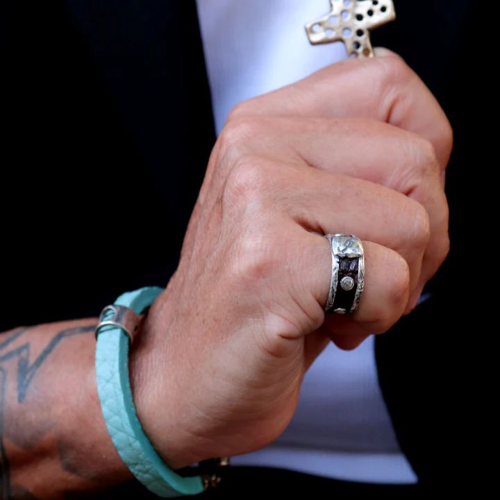 Anillo Plata de Palo elegante para hombre en plata maciza con tira de cuero y puntos en plata de ley. El anillo Hokai de Plata de Palo es una joya que transmite fuerza interior y presencia silenciosa, anillo que sugiere transformación y profundidad, con un diseño sobrio y estructurado, este anillo es ideal para quienes valoran la elegancia contenida y el simbolismo personal.