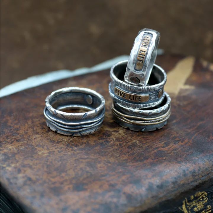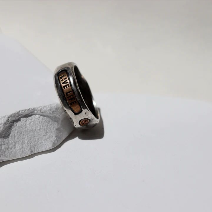 Anillo hombre de plata 925 de forma irregular con placa de bronce "Live life" y la marca de PLATA DE PALO. El anillo Fuyu de PLATA DE PALO es una pieza que transmite seguridad y fortaleza. Su nombre, que en japonés significa “invierno” inspira quietud, resistencia y belleza contenida. La combinación de plata y bronce crea un contraste sutil entre lo frío y lo cálido, reflejando el equilibrio entre reflexión y acción. Es un anillo pensado para acompañar con carácter, como un recordatorio constante de que cada momento merece ser vivido plenamente con intensidad.