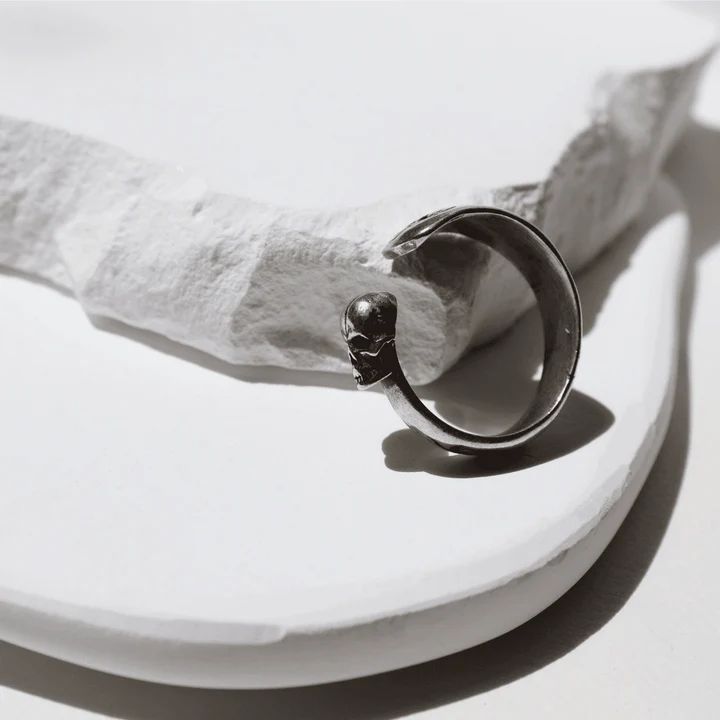 Anillo PLATA DE PALO unisex Yomi elaborado a mano en plata de ley 925 abierto, que acaba en un lado en forma de calavera con silueta y en el otro con forma de calavera grabada. Esta pieza está pensada para quienes han atravesado sus propias profundidades y que han hecho de la oscuridad una fuente de sabiduría y energía.