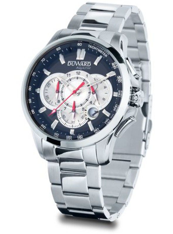 Es un reloj DUWARD para hombre acabados de primera calidad, equipado con cronógrafo, corona de acero protegida con doble junta, cierre desplegable, cristal mineral zafiro anti-reflejante, caja y pulsera de acero inoxidable 316L, diámetro caja 44mm, grosor 12,8mm, sumergible a 10 ATM,