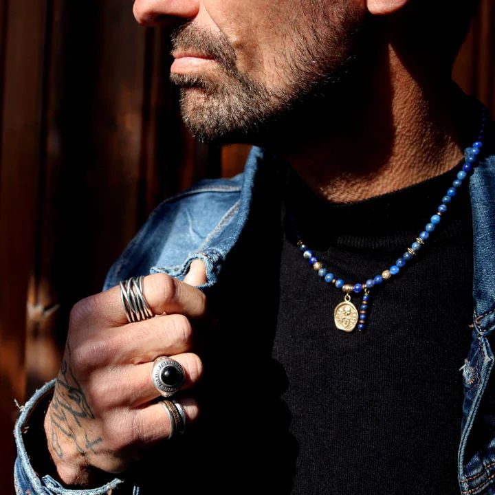 Collar PLATA DE PALO masculino de 50 cm de longitud compuesto por esferas de ónix negro en acabado brillo. La pieza central consiste en un colgante de bronce con forma de llave, complementado con piezas de bronce envejecido y un cierre de mosquetón de Plata 925. El nombre Nadir significa "raro", "precioso" o "único". Es una denominación que suena con autoridad y elegancia, ideal para resaltar la exclusividad y el carácter distintivo de esta pieza. Es un accesorio diseñado para un uso diario versátil. El contraste del negro profundo con el metal noble envejecido le otorga un estilo étnico y atemporal. Este producto está hecho artesanalmente en España por PLATA DE PALO.