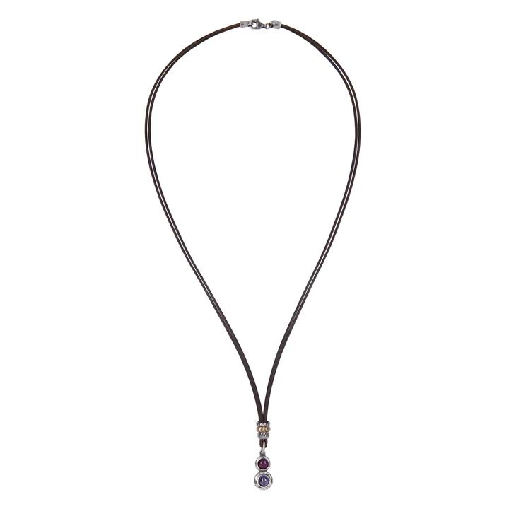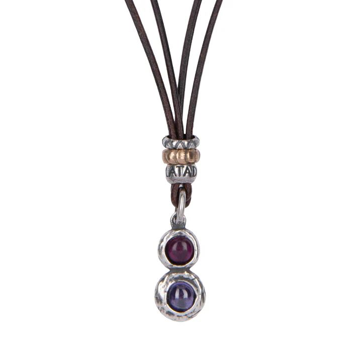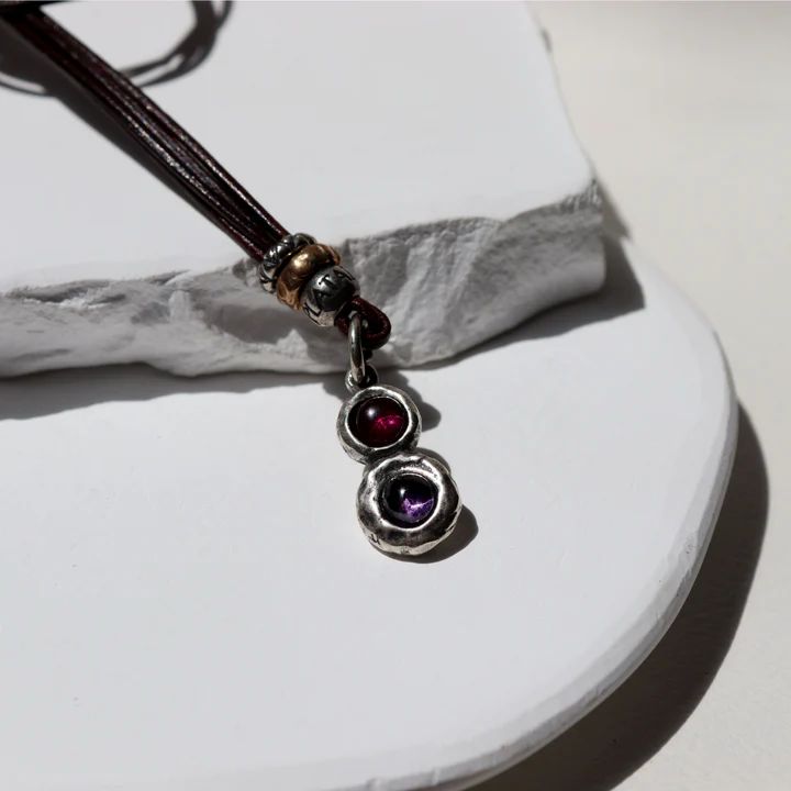 Collar PLATA DE PALO fino y elegante de buena calidad de cuero para mujer Kage con lágrima central de plata 925 que engarza dos piedras circulares de 5 mm de rubí y amatista. Cierre mosquetón de seguridad. El collar Kage es la elegancia que se oculta en los matices, la belleza que surge en el delicado equilibrio entre luz y sombra. Su nombre, que en japonés significa “sombra”, evoca misterio, profundidad y la sutileza de lo que se insinúa más que se muestra. Es un símbolo de sofisticación interior y armonía, pensado para acompañarte como un recordatorio de que la verdadera fuerza reside en lo que permanece en calma, esperando el momento justo para revelarse.