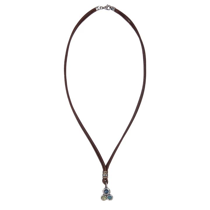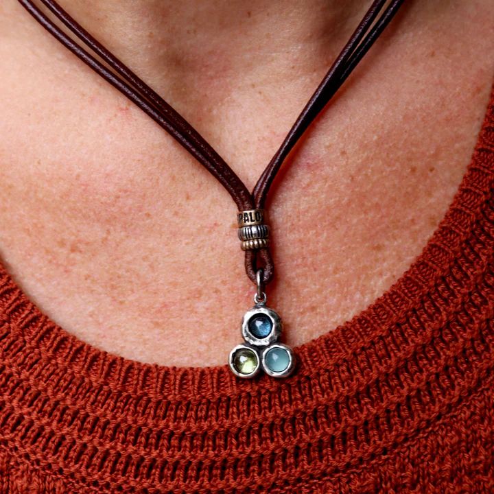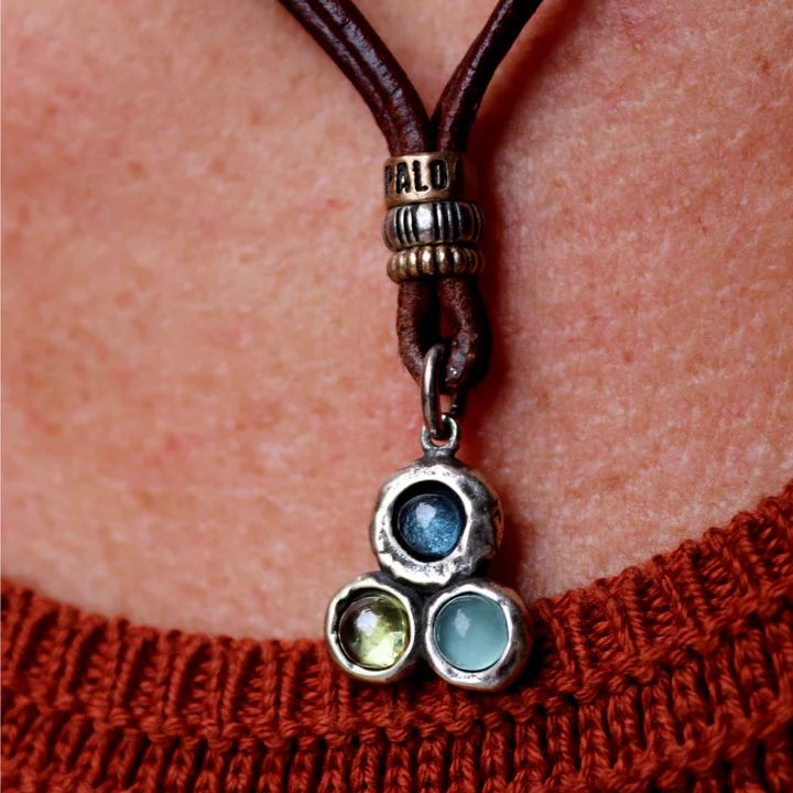 Collar Plata de Palo de cuero para mujer modelo Kaiko con pieza decorativa de plata 925 y tres piedras preciosas circulares de 5 mm de aguamarina, verde, y olivina, Cierre mosquetón de seguridad. El collar Kaiko es un canto a la serenidad que habita en lo profundo, un susurro del mar que invita a la calma y a la introspección. Su nombre, que en japonés significa “océano profundo”, evoca la fuerza silenciosa y la belleza que se revelan cuando todo fluye en equilibrio. Es un símbolo de conexión con la naturaleza y de armonía interior, pensado para acompañarte como un recordatorio sutil de que la verdadera elegancia nace de la paz que llevas dentro.