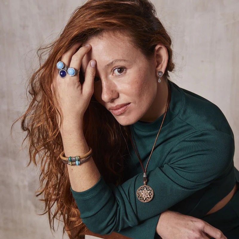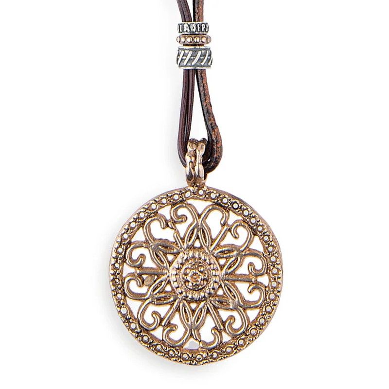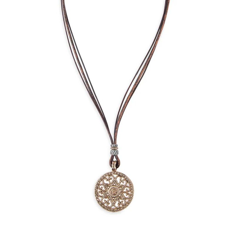 Este collar único PLATA DE PALO combina la textura del cuero con la delicadeza de la filigrana y la cenefa de bronce. Tres tiras de cuero, una brillante y dos en marrón oscuro, sostienen un colgante circular elegante y de buena calidad, creando un accesorio llamativo y versátil.