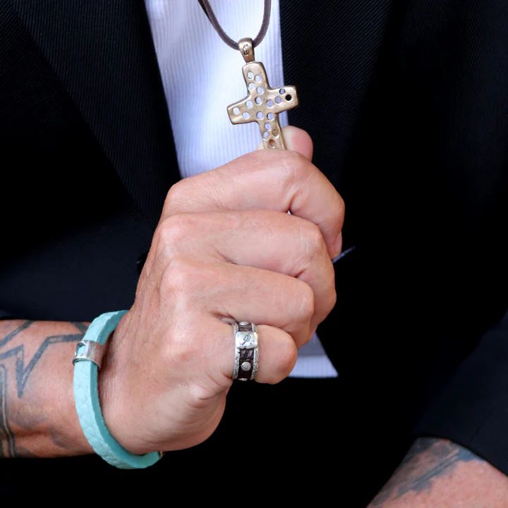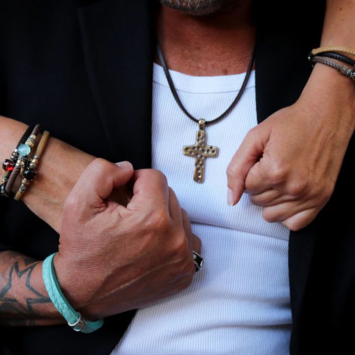 Collar para hombre Kurai Yoru de cuero de 4 mms de ancho y 60 mms de largo, colgante cruz con agujeros de bronce y entre piezas de plata y bronce, cierre mosquetón de seguridad en plata de ley 925. El collar Kurai Yoru que en japonés significa “noche oscura”es una joya que encarna el poder del silencio y la presencia que no necesita palabras. Esta pieza está pensada para hombres que encuentran fuerza en lo invisible, que caminan con convicción incluso en la penumbra. Kurai Yoru no es solo un collar: es un símbolo de profundidad emocional, de quien abraza lo desconocido y transforma la oscuridad en identidad.