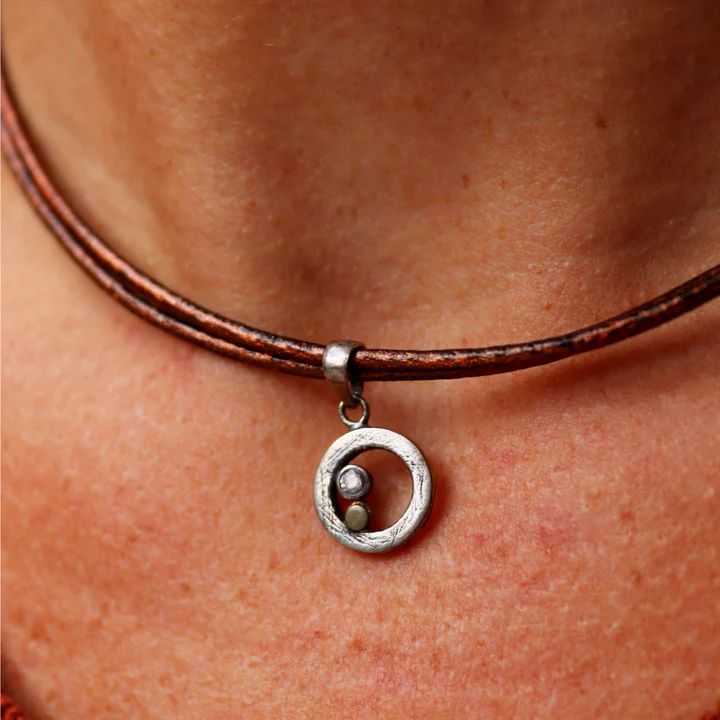 Collar Plata de Palo muy moderno doble de cuero de 45 cm para mujer colección ENSO con colgante en forma de círculo en plata de ley 925 detalle de punto en bronce y circonita. Cierre mosquetón también en plata 925 que garantiza durabilidad y un acabado elegante. Diseño artesanal y moderno, ideal para un look con carácter y estilo único. El collar ENSO es la representación de la vida como un ciclo continuo donde cada círculo simboliza crecimiento y transformación, y cada punto, esos instantes de claridad que iluminan el camino. Su nombre, que en japonés significa “círculo” o “conexión”, evoca armonía, unión y equilibrio. Es una pieza que transmite movimiento y serenidad a la vez, pensada para recordarte que cada giro y cada pausa forman parte de una misma historia llena de significado.