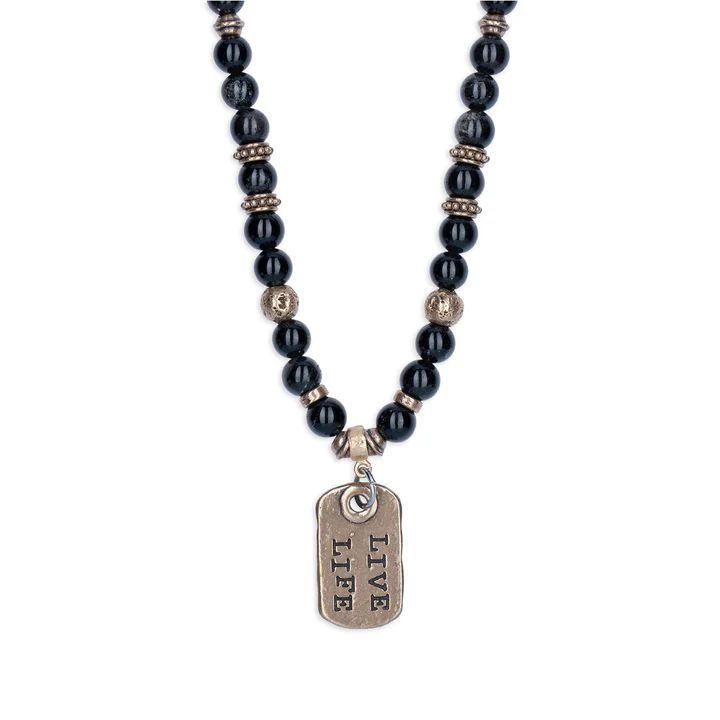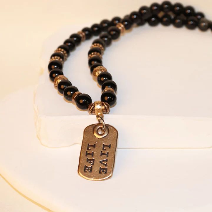 Este collar PLATA DE PALO para hombre de 50 cm está formado por piedras de ónix negro y piezas de bronce envejecido. Presenta una pieza central en forma de placa de bronce con el mensaje "LIVE LIFE". Tiene un cierre de mosquetón de Plata 925 muy resistente. Su nombre se inspira en el Riad, la casa tradicional con patio interior y jardín, un espacio de calma y fortaleza que refleja la sobriedad de este diseño. Es una pieza con mucha fuerza y un estilo marcadamente masculino. El color negro profundo del ónix lo convierte en un accesorio básico y elegante que puedes llevar con cualquier tipo de ropa. Este producto está hecho artesanalmente en España por PLATA DE PALO.