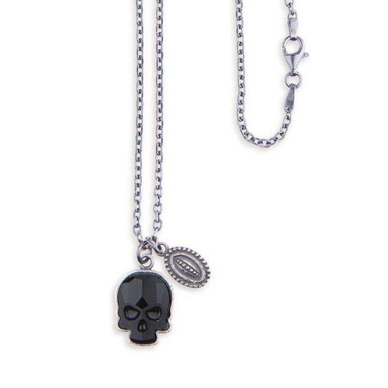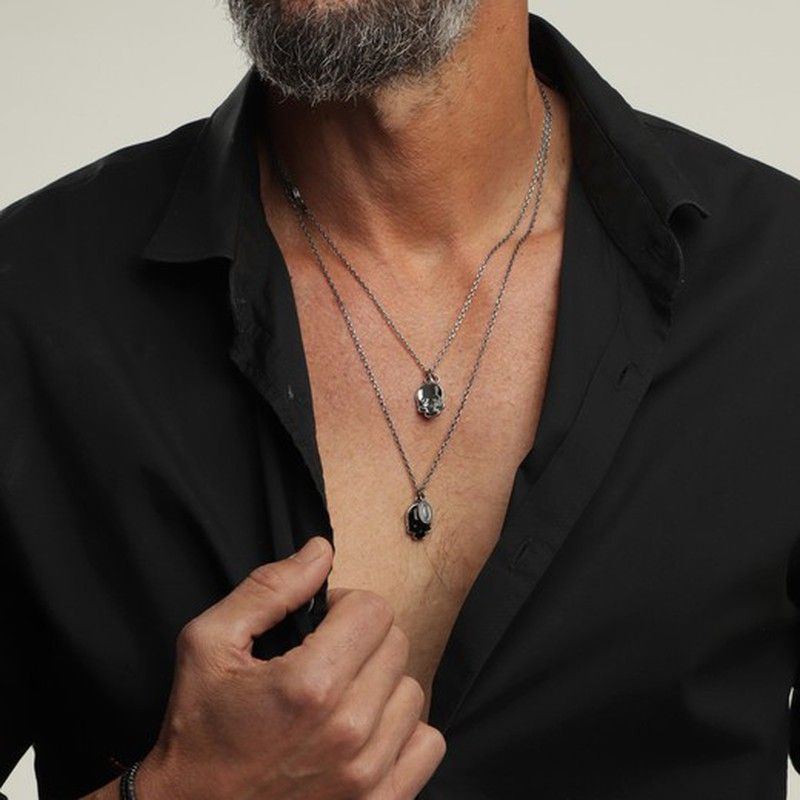 Collar Plata de Palo para hombre con calavera de Swarovski de color negro tamaño 14x10,5mm con soporte de plata, medalla y cadena en plata 925. Diseñado y elaborado a mano artesanalmente por Plata de Palo en España. Largo de 60 centímetros.