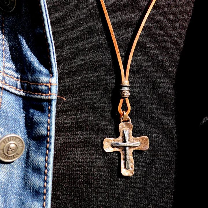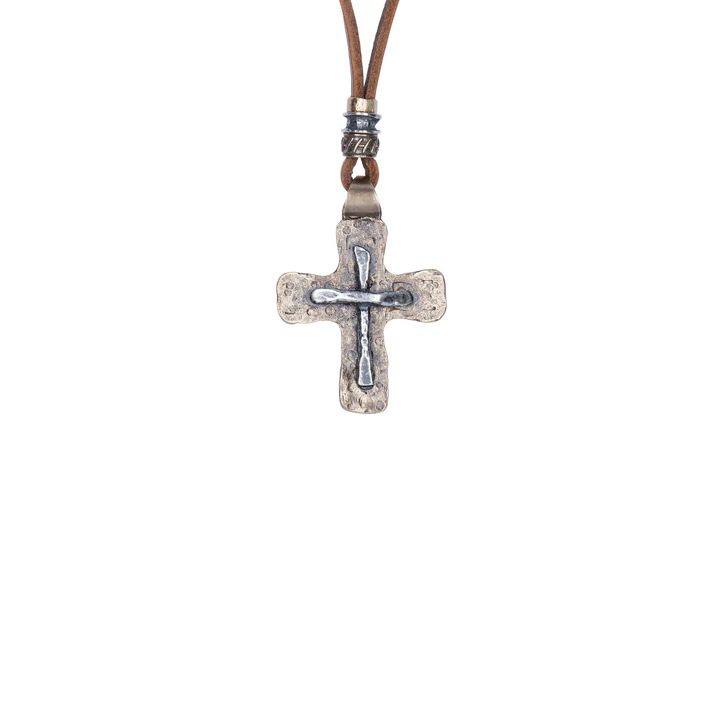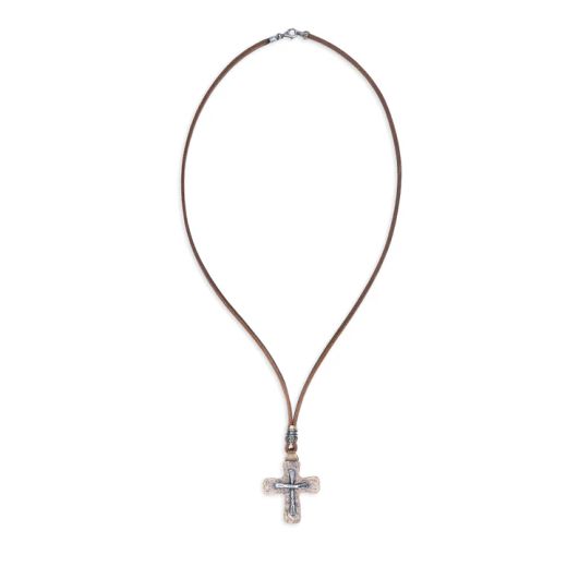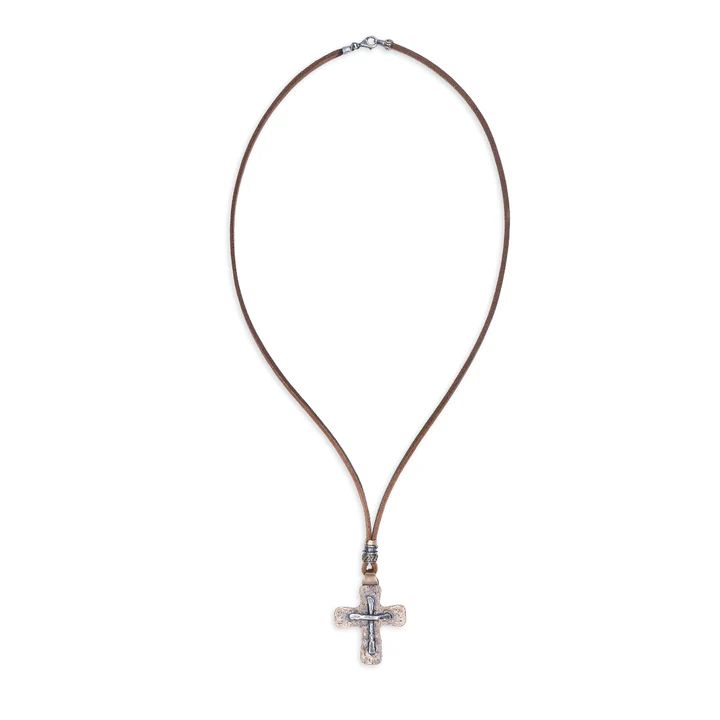 Collar PLATA DE PALO para hombre modelo Derb, es una pieza original y artesanal hecha a mano en España por PLATA DE PALO, que combina plata de 1ª ley 925, cuero y bronce con un colgante en forma de cruz, creando un diseño elegante, moderno y masculino. La combinación de materiales aporta fuerza, textura y estilo, mientras que los acabados en plata realzan la presencia y sofisticación de la pieza.