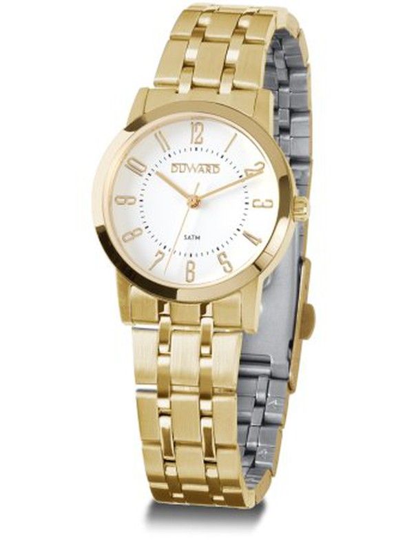 Reloj DUWARD de pulsera para mujer de acero inoxidable 316L chapado con tratamiento IP dorado. La caja, la esfera, la tija y agujas en color oro. Resistencia al agua a 5 ATM, cierre desplegable de seguridad muy elegante y de categoría, movimiento cuarzo analógico.