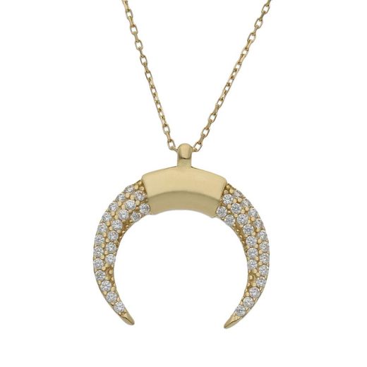 Colgante gargantilla elaborado en oro amarillo 1ª ley de 18 kilates (750 milésimas). Colgante combinado por una media luna invertida con circonitas que lo deja muy elegante, acabado pulido. El colgante mide 20x18mm. Es perfecto para las amantes de las joyas finas, modernas y discretas.
