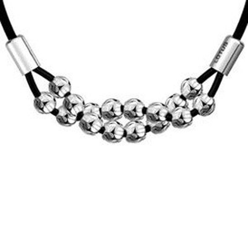 Gargantilla Lotus style montada en piel negra combinada con ocho bolas aparejadas de dos en dos y trabajadas como si de una cenefa se tratara, acabada con embellecedores que lo rematan en cada lado dejándola más elegante y esbelta. cierre cajón de seguridad. Medida : 21 cm. Lotus Style LS1148-1-1. Joyería Pont.