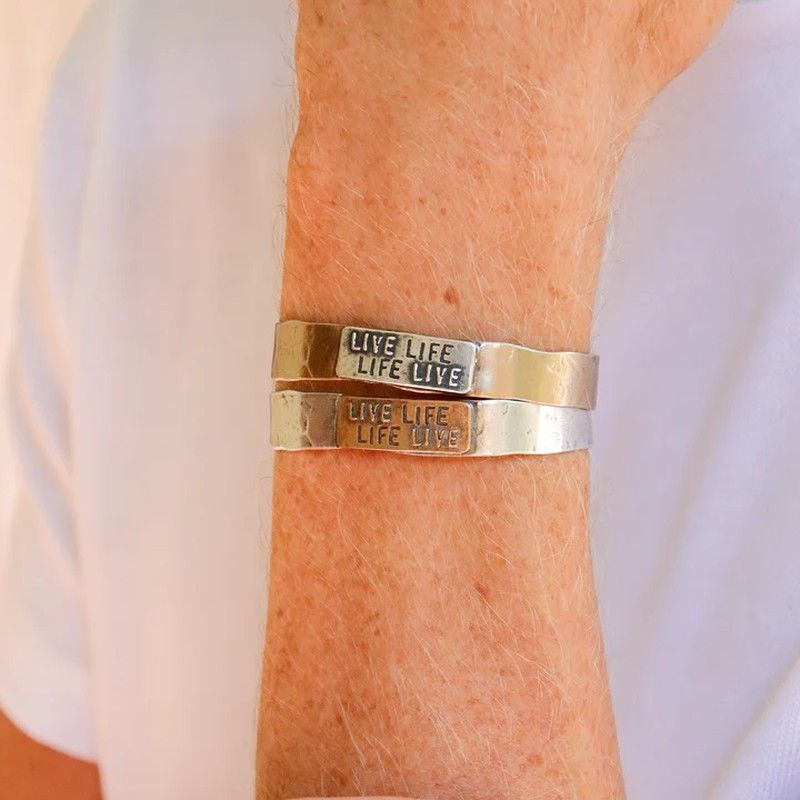 La pulsera rígida Live Life de PLATA DE PALO unisex es una expresión de carácter y espíritu aventurero. Elaborada a mano en bronce y plata de ley, pulsera maciza, corpulenta y elegante. Predomina una placa sobre puesta en el centro hecha en plata de 1ª ley 925 con la anotación, Live Life Life Live