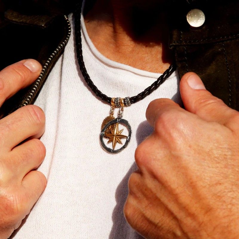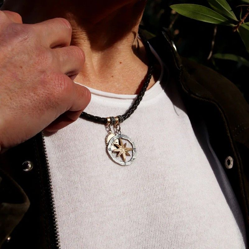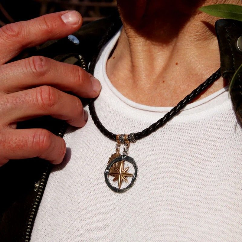 Colgante con diseño único de Plata de Palo, combina la calidez del cuero marrón trenzado con el brillo del bronce y la plata, símbolo de aventura y exploración, es el punto de este diseño original y super moderno. La medalla de bronce con el norte añade un toque náutico, mientras que las entrepiezas de bronce y plata complementan el conjunto.