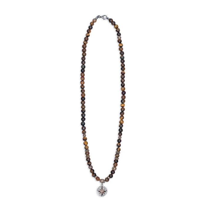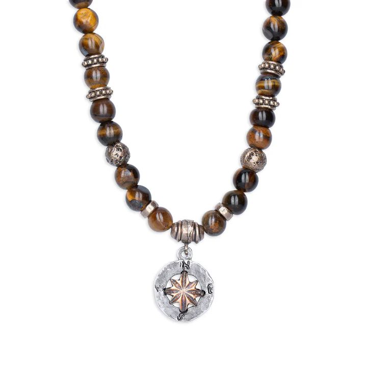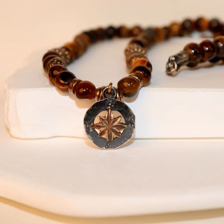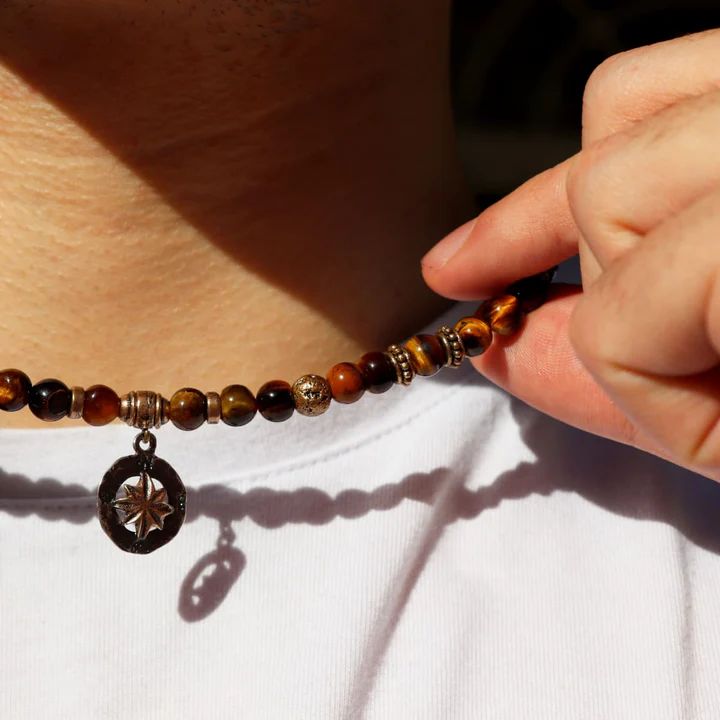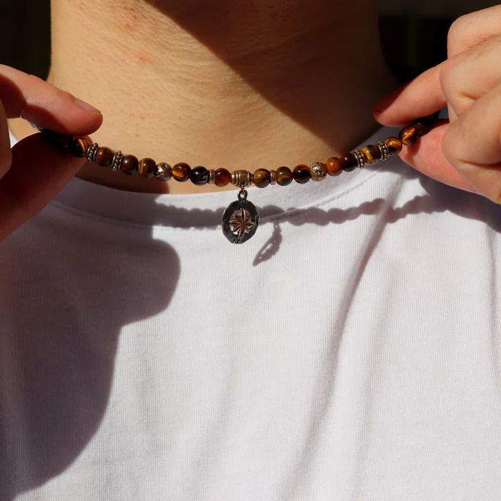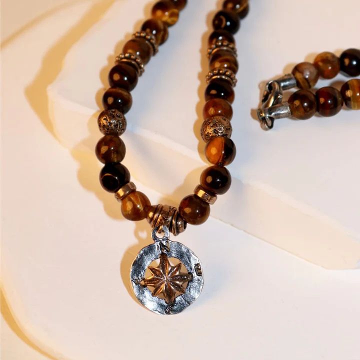 Collar masculino de 50 cm elaborado de piedras de ojo de tigre, conocidas por sus reflejos en tonos marrones y dorados. El diseño incluye un colgante central en plata de 1ª ley 925 con el símbolo de la rosa de los vientos y piezas decorativas en bronce envejecido. El nombre Duna hace referencia a los tonos tierra y dorados de la piedra que cambian con la luz, recordándonos a las montañas de arena del desierto. Su diseño está inspirado en los colores de la arena y la tierra, siendo ideal para quienes buscan un accesorio con un aire aventurero y conspirador. Es un collar de hombre cómodo y confortable que aporta un toque de luz natural al cuello. Este producto está hecho artesanalmente en España por PLATA DE PALO.