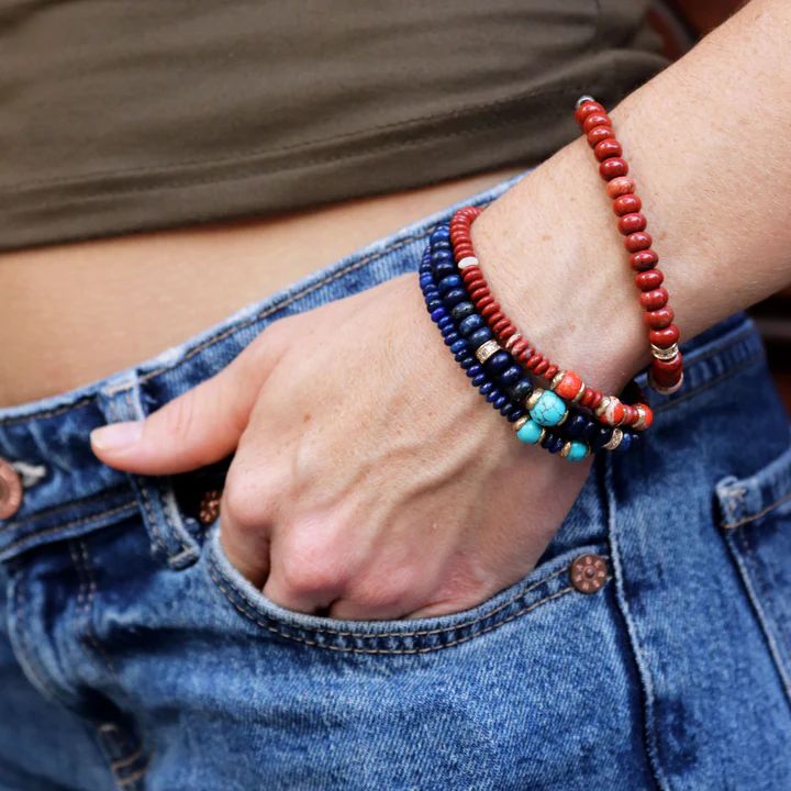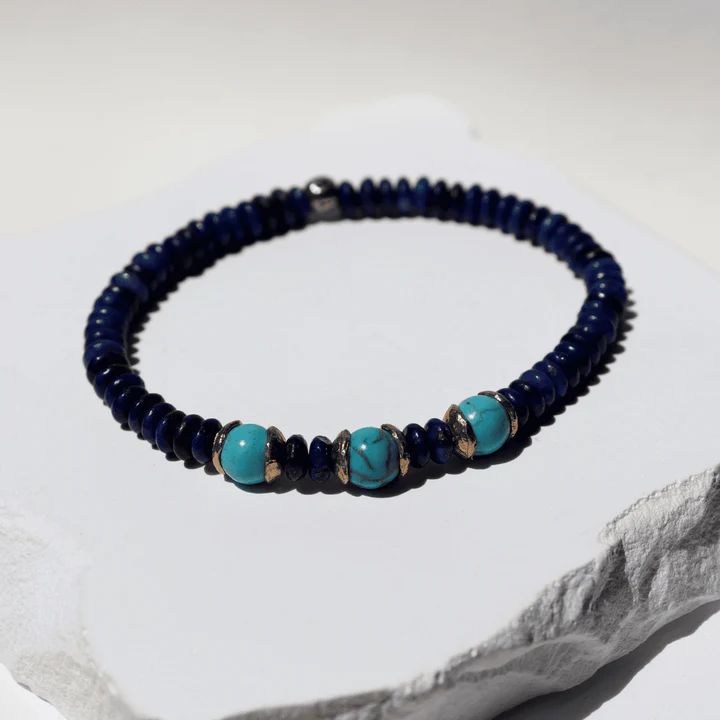 Pulsera Plata de Palo para mujer colección Hakanai de bolas pequeñas elástica de piedras lapislázuli en forma circular de 4 mms, casquillos de bronce y piedras turquesas reconstituidas. Es ideal para mujeres que valoran la meditación, la unión emocional y el estilo con significado, es una pulsera elegante y de buena calidad.
