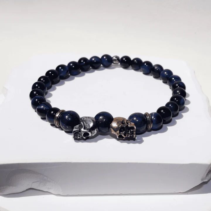 Pulsera PLATA DE PALO unisex elástica de bolas de piedras ojo de tigre azul de 6 mm con dos calaveras, una de plata y la otra de bronce. El ojo de tigre azul potencia la intuición, la calma mental y la visión clara en momentos de desafío. Esta pieza está pensada para quienes viven con rectitud y honradez, que actúan desde el convencimiento y encuentran belleza en la disciplina interior.
