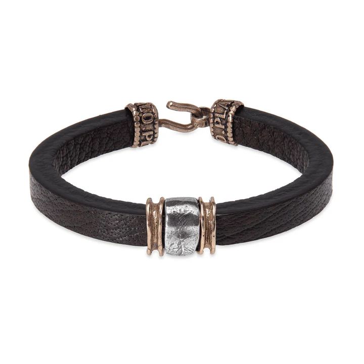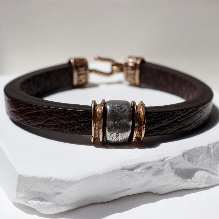 Pulsera enérgica de Plata de Palo para hombre modelo Kokyu elaborada a mano con cuero y pieza central en plata de 1ª ley, dos piezas de bronce y cierre con gancho de bronce. El cuero tiene carácter y autenticidad, mientras que las piezas de plata y bronce simbolizan la dualidad entre lo sutil y lo firme, lo moderno y lo ancestral. Esta pulsera está pensada para hombres que valoran la armonía entre fuerza y sensibilidad.