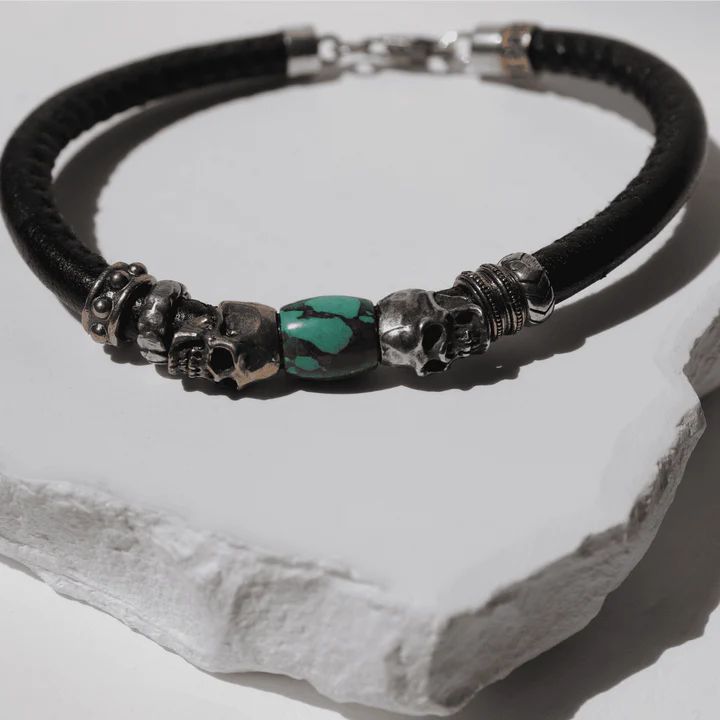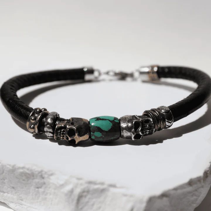 SB215X Pulsera Plata de Palo colección Kuro Enso de cuero con calaveras y resina turquesa