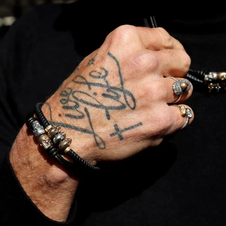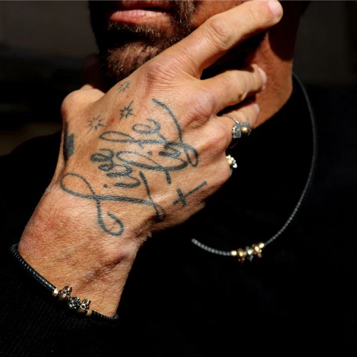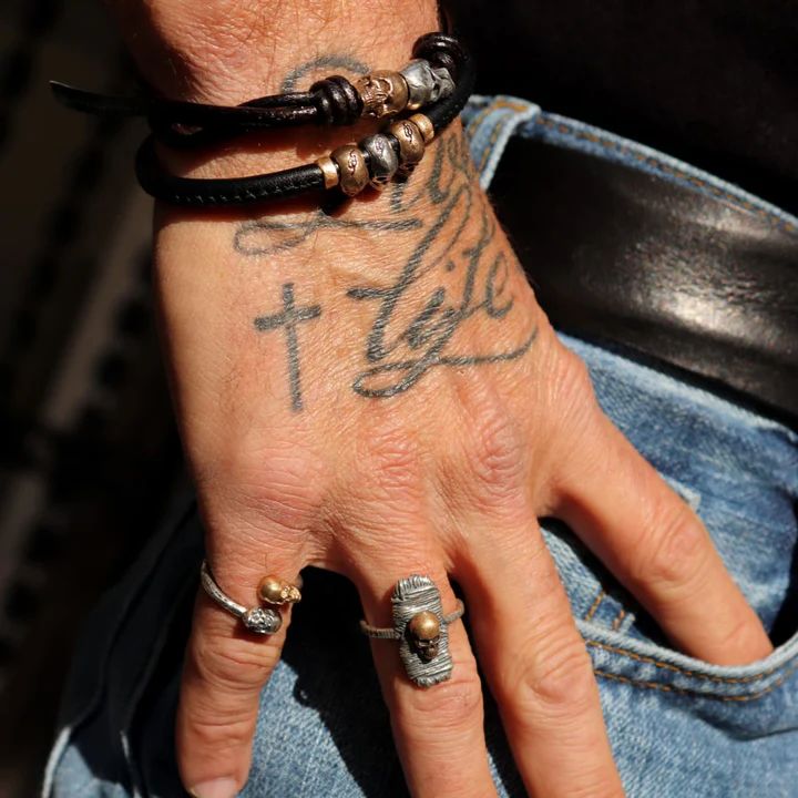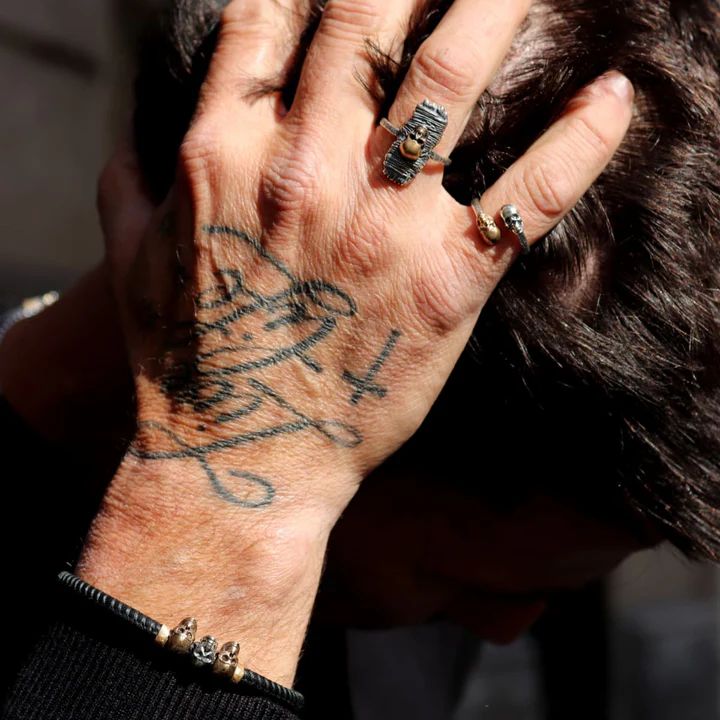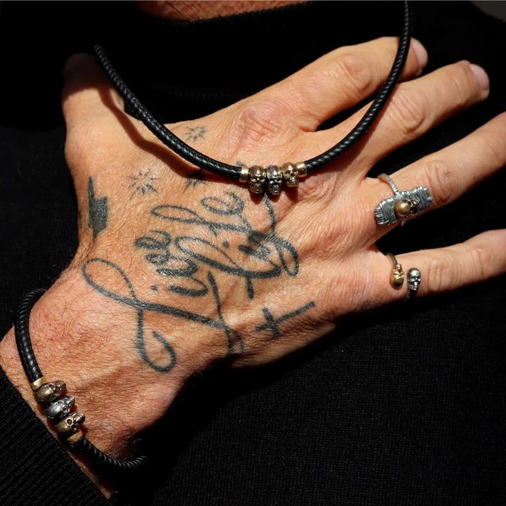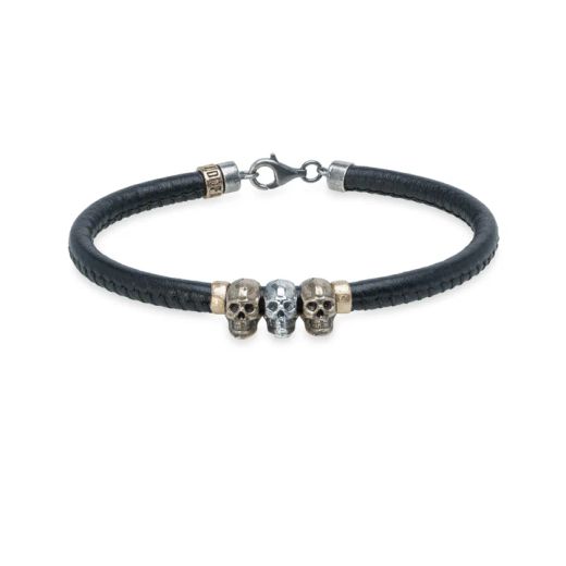 Una pulsera PLATA DE PALO que combina audacia, estilo y carácter, perfecta para quienes buscan un accesorio único y distintivo. La Pulsera Calavera Rif es una pieza artesanal hecha a mano en España por PLATA DE PALO, que une 3 calaveras de plata 925 y bronce con un cuero tejido a mano, para un diseño moderno, elegante y con personalidad. El contraste entre los detalles en plata y el cuero aporta fuerza, textura y estilo, mientras que el acabado pulido resalta la presencia y sofisticación de la pieza. Va a conjunto con el collar y el anillo Rif. TALLAS: 16, 17, 18, 19, 20, 21, 22 y 23 cm.