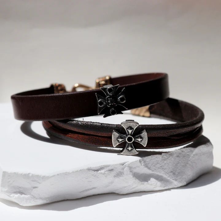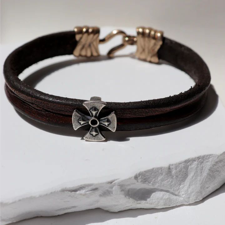Pulsera PLATA DE PALO de hombre elaborada a mano de cuero marrón y pieza central cruz en plata de ley y cierre de bronce en forma de gancho de seguridad. El cuero aporta robustez y certeza, mientras que la cruz representa seguridad, protección o propósito, según lo que cada hombre decida pensar. Esta pieza está pensada para quienes enfrentan la vida con coraje, valentía y esfuerzo.