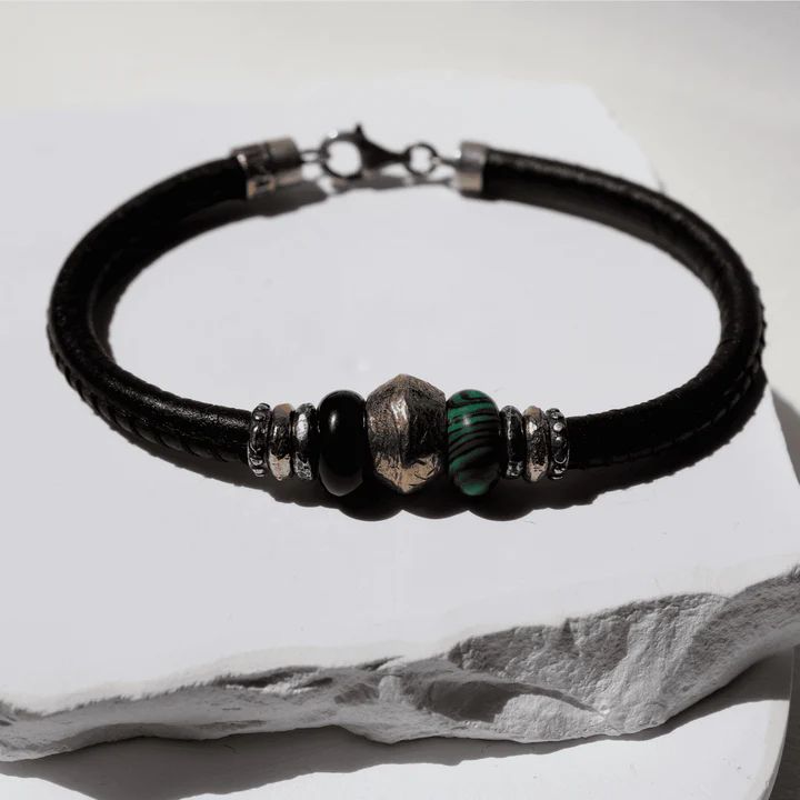 Pulsera vibrante Plata de Palo para hombre colección Hotaru de cuero marrón oscuro con pieza central de bronce, resinas verde y negra, decorada con piezas de plata y bronce. Su nombre, que en japonés significa “luciérnaga” inspira belleza y elegancia. El cuero aporta textura y carácter, mientras que el bronce introduce calidez y firmeza. El jade, símbolo de sabiduría y equilibrio, añade una dimensión espiritual y serena. Juntos, estos elementos crean una pulsera pensada para hombres que valoran la elegancia.