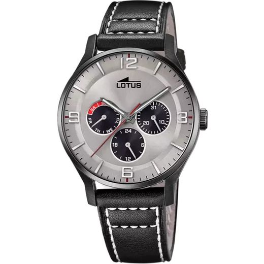 Reloj Lotus bonito y elegante para hombre, caja de acero inoxidable 316L montado con cristal mineral, equipado con correa de cuero, movimiento cuarzo analógico, multifunción, esfera gris, color de la correa negro, un diseño para lucir cada día de la semana. Los relojes Lotus ofrecen diseños exclusivos, de última generación para un público contemporáneo, urbano y moderno.