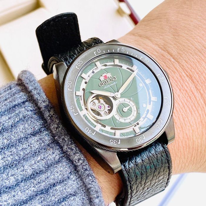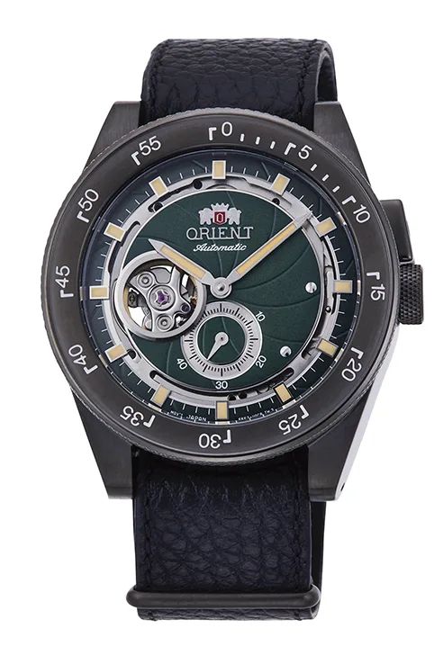 Reloj Orient de hombre RETRO FUTURE CAMERA GREEN con brazalete de piel de buena calidad. Color de la esfera verde muy elegante. Corona a presión. Cristal mineral resistente y sólido. Diámetro de la caja 40.8mm. Grosor de la caja 11.6mm. Funcionalidades: Tres agujas, equipado con calendario, reserva de carga +40H, mecanismo de detención del segundero. Movimiento automático Orient calibre F6S22. Otras características Semi Skeleton. Reserva de carga 40H. Resistencia al agua 50 metros (5ATM). Tapa trasera del reloj atornillada. Garantía dos años con servicio técnico oficial incluido.