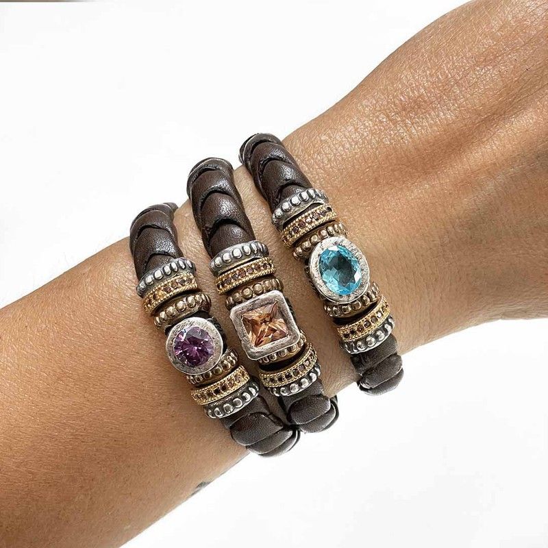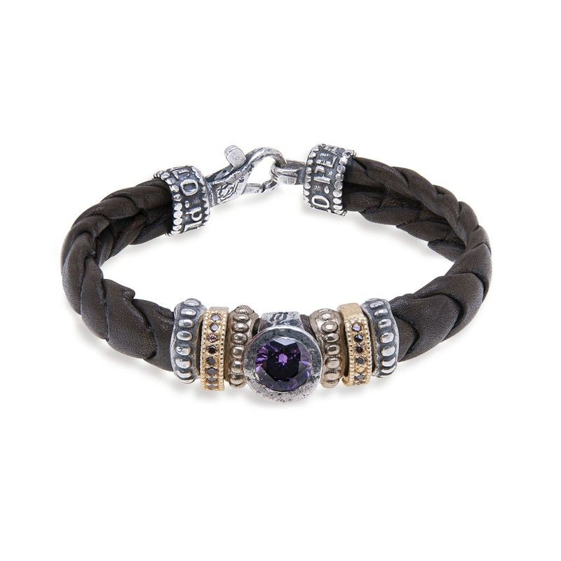 Pulsera PLATA DE PALO de mujer elaborada en cuero de 10mm en forma de trenzado, piezas de plata 925, bronce, circonitas, piedra central cuarzo de color amatista de 8mm y cierre mosquetón en plata 925 con la inscripción PLATA DE PALO identificativa de la marca. Tallas : 17, 18, 19, 20, 21, 22 y 23 cm.