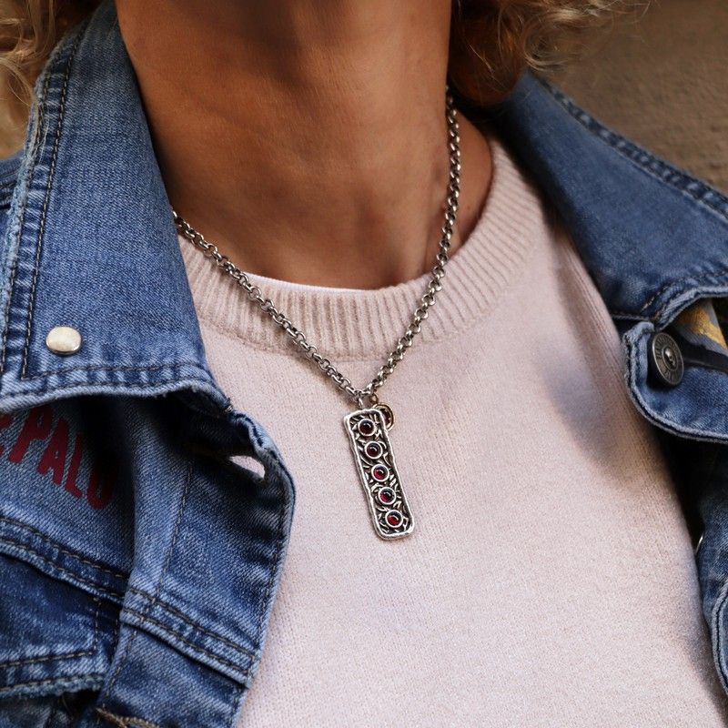 Colgante PLATA DE PALO para mujer elegancia extrema. Descubre la elegancia atemporal con el nuevo collar para mujer de PLATA DE PALO. Este exquisito collar, chapado en 10 micras de plata, es una pieza que deslumbra por su belleza y sofisticación. Cada detalle de este collar ha sido cuidadosamente diseñado para resaltar la feminidad y el estilo único de quien lo lleva. La chapa colgante, adornada con cinco cristales de granate natural, añade un toque de color y brillo sutil que captura la atención con cada movimiento. Diseñado y hecho a mano artesanalmente por PLATA DE PALO en España.