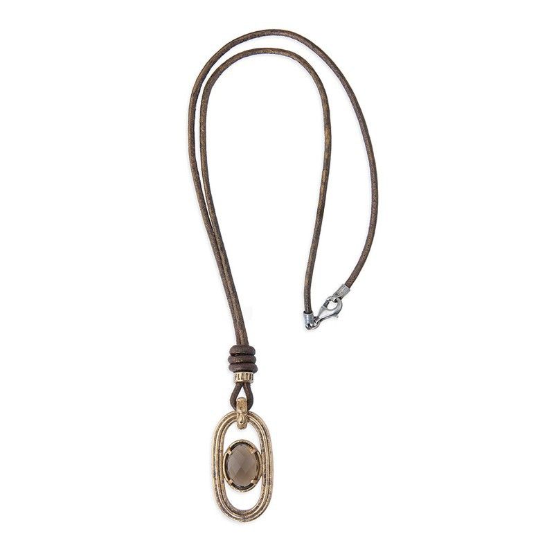 WN210X Collar PLATA DE PALO mujer en bronce y cuarzo fumé facetado en cuero
